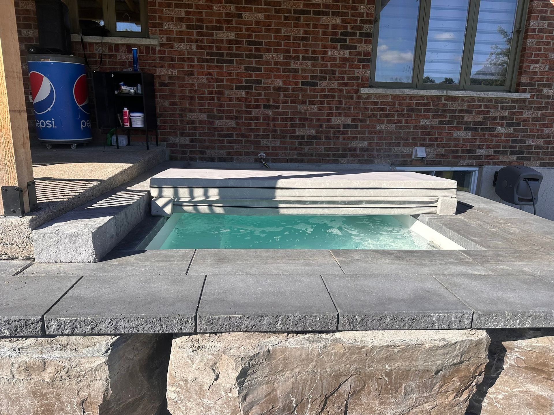 Les surfaces sont aménagées en pavé uni Para nickel grisé, offrant un rendu moderne et intemporel. L’espace détente comprend une piscine en fibre 10 x 20 et un spa en fibre 7 x 9, parfaitement intégrés au design.