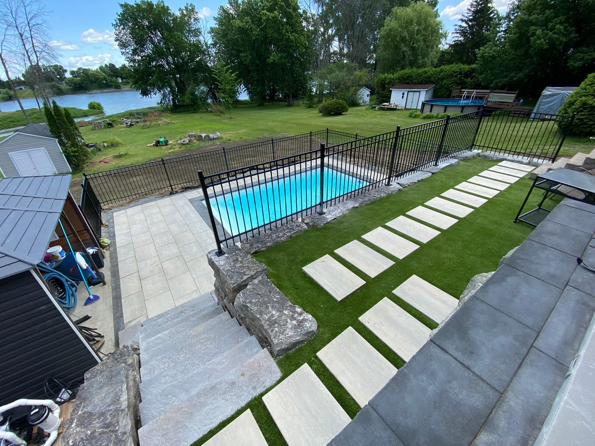 Le projet est complété par du gazon synthétique pour un entretien minimal et une clôture ornementale en acier galvanisé peint à chaud, assurant sécurité et longévité sans compromis sur l’esthétique.